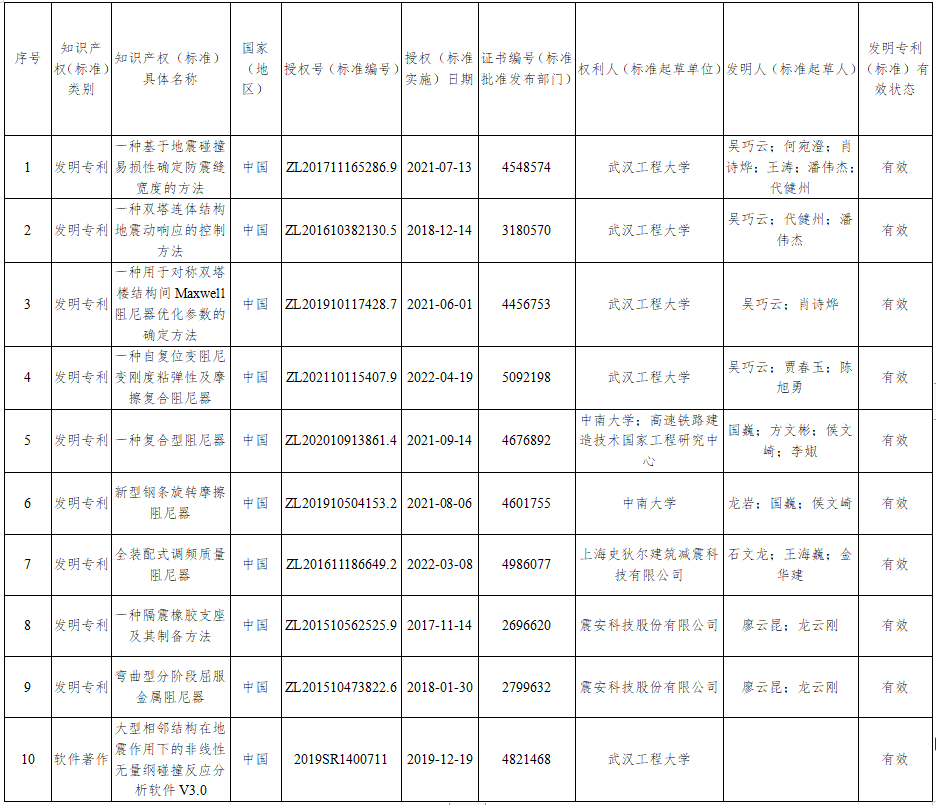 主要完成單位:武漢工程大學、中南建筑設計院股份有限公司、震安科技股份有限公司、上海史狄爾建筑減震科技有限公司、中南大學、武漢博宏建設集團有限公司、福州大學、湖南省建筑設計院集團股份有限公司、中信建筑設計研究總院有限公司、高速鐵路建造技術國家工程研究中心